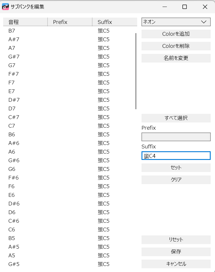 音源の数だけ「Colorを追加」して、Suffixを編集します。prefix.mapを参考にしました。 「保存」を押すとウィンドウが閉じます。少しの間フリーズすることがあるので(待っていたら保存される)、1つColorを編集する度に保存してもいいかも。